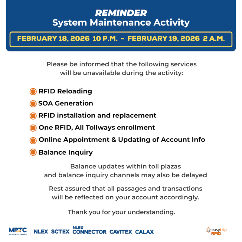 Enroll your Easytrip RFID to the One RFID, All Tollways program and use your load to pay for toll in NLEX, SCTEX, NLEX Connector, CAVITEX, C5 Link and CALAX.