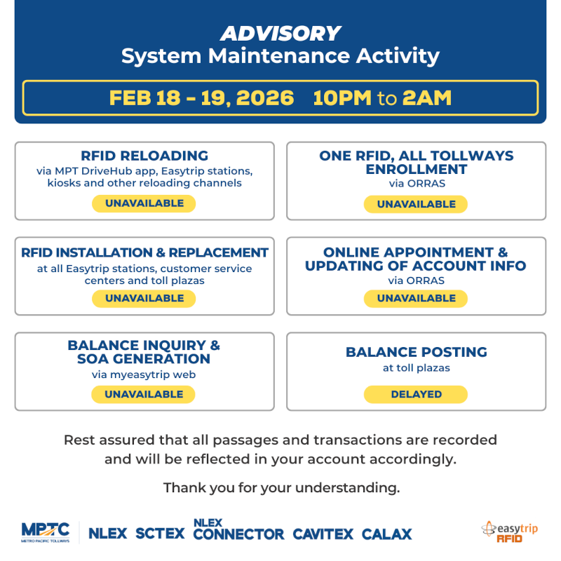 Enroll your Easytrip RFID to the One RFID, All Tollways program and use your load to pay for toll in NLEX, SCTEX, NLEX Connector, CAVITEX, C5 Link and CALAX.
